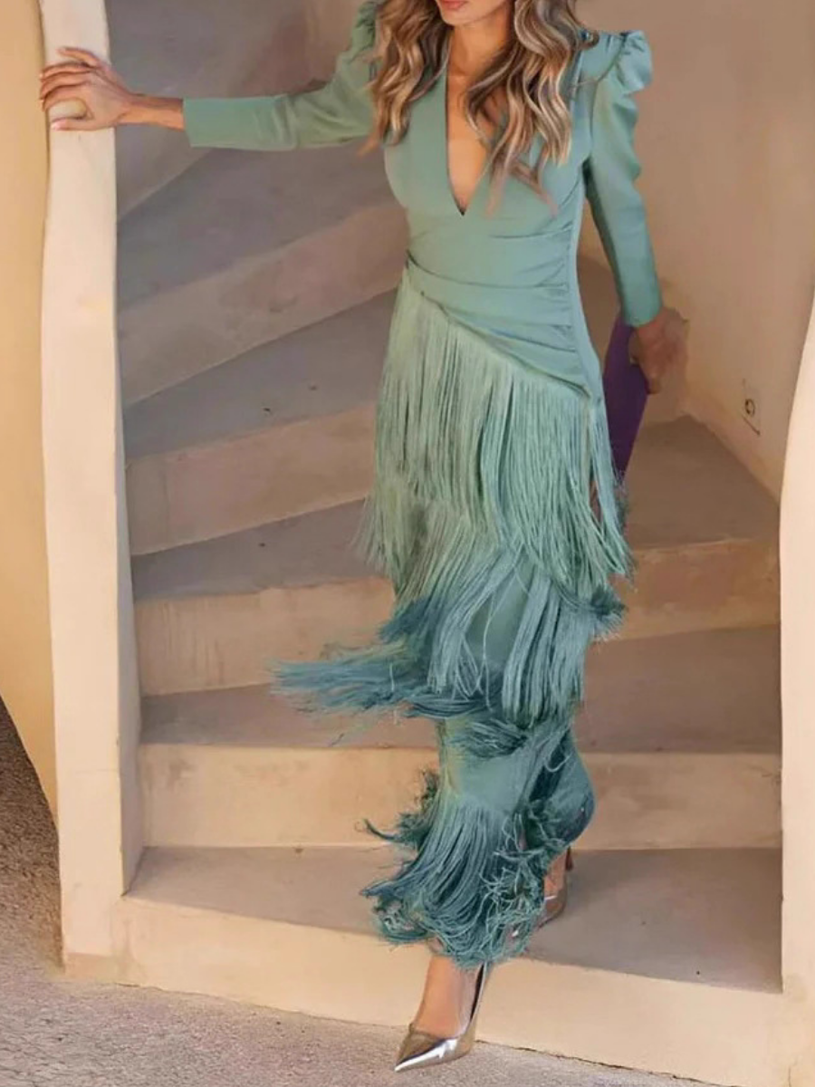 - Long sleeve, solid color, blue, tassel, ruched, midi dress