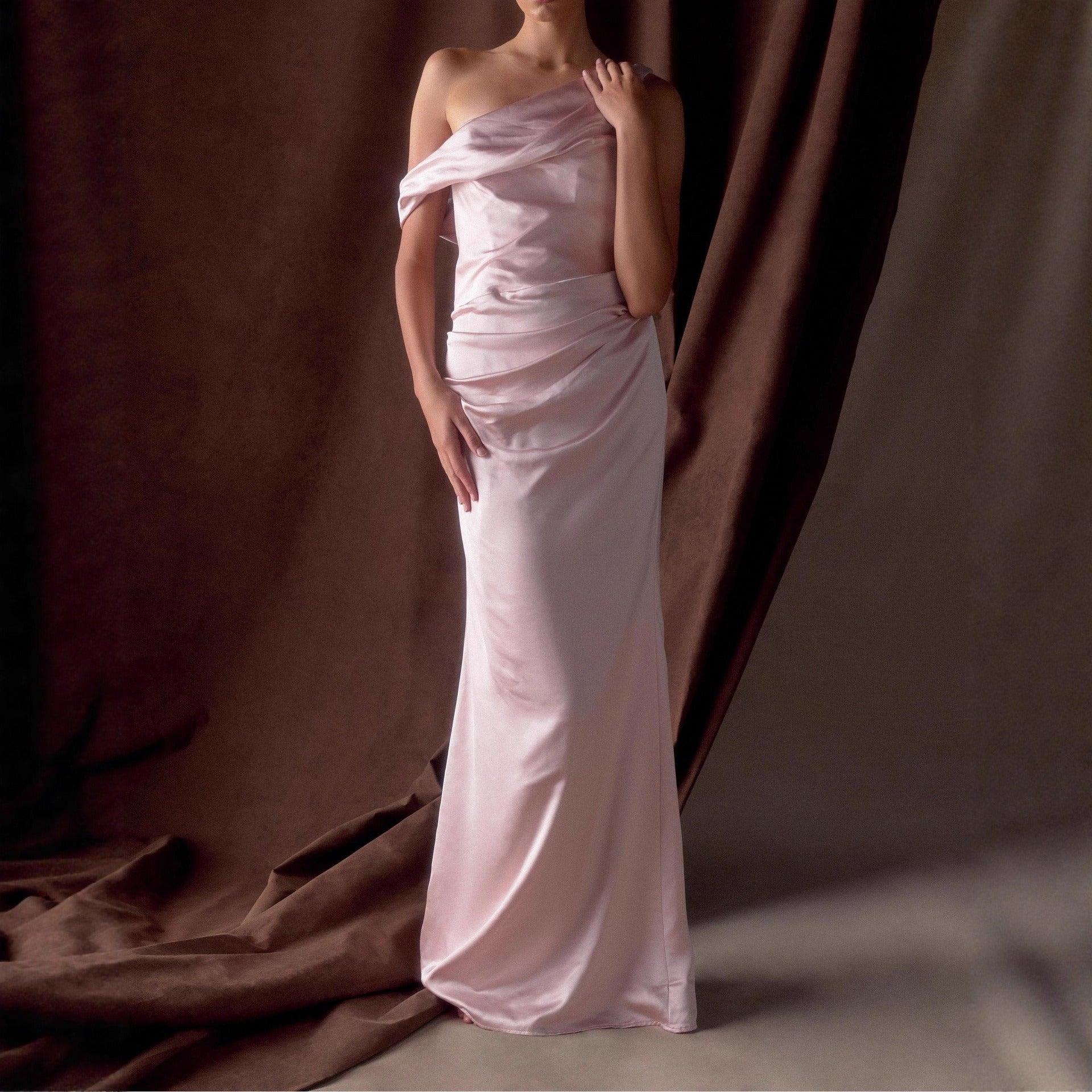 Elegantly sculpted in stretch satin, this one-shoulder gown brings modern glamour to any formal moment. The asymmetric draped neckline softens the silhouette, while the body-skimming mermaid fit highlights your natural curves with smooth, fluid shine. Subtle ruched detailing enhances the waist, and the clean back closure creates a refined finish. Designed for comfort and confident movement, this statement gown is perfect for prom, evening galas, weddings, red carpet events, and any occasion where sophisticated drama is the dress code.